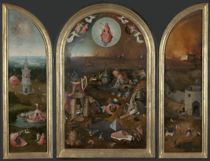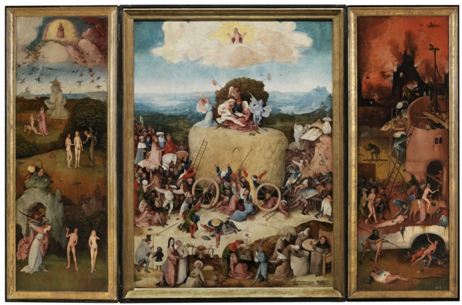 Alrededor del Carro de heno se incorporan, varios trípticos del Bosco en los que el Paraíso y el Infierno aparecen representados en las tablas laterales, aunque varíe la forma de mostrarlos. Tradicionalmente, en la tabla central se incluía el Juicio Final, como sucede en el ejemplar de Brujas. En las Visiones del Más Allá de Viena, más que la visión del infierno, resulta original –y aún sorprendente- la del paraíso, con el túnel de luz deslumbrante que atraviesan los elegidos para llegar al Empíreo.