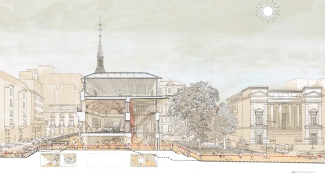 El diseño seleccionado responde holgadamente al programa de necesidades espaciales definido por el museo, sin necesidad de excavar nuevos sótanos y realzando los espacios históricos que forman el núcleo del edificio, en especial el Salón de Reinos. Del mismo modo, fortalece y consolida la identidad del campus del Museo del Prado, proponiendo la potenciación peatonal del eje Parque del Retiro – Paseo del Prado, a través de la calle Felipe IV, lo que revitalizaría su conexión con la ciudad.