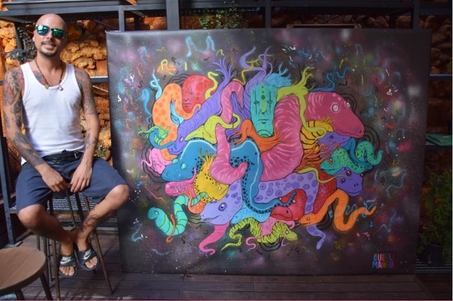 El artista alicantino Cuellimangui será sin duda uno de los grandes triunfadores de la Segunda Edición del Street Art & Food Festival, que se celebra del 3 al 27 de julio en el Mercado de San Ildefonso de Madrid. El artista alicantino pintó in situ una obra que desató pasiones entre los visitantes del Mercado, tanto por la frescura de su ejecución como por su calidad.