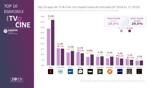 El Estudio General Mobile, EGMobile®, elaborado por Smartme Analytics, empresa pionera en el uso de Tecnología Observacional ha conseguido ofrecer por primera vez en España, datos de posicionamiento y cuota de mercado en España de las principales apps de televisión y cine que consumen los ciudadanos españoles. Así: Netflix, Prime Video, YOMVI, MiTele, HBO, Atresplayer, Megadede, Gran Hermano, Vodafone TV y Orange TV se posicionan como las 10 primeras de ranking. A ellas les siguen: Appflix, Cinesa y RTVE.es, entre otras.