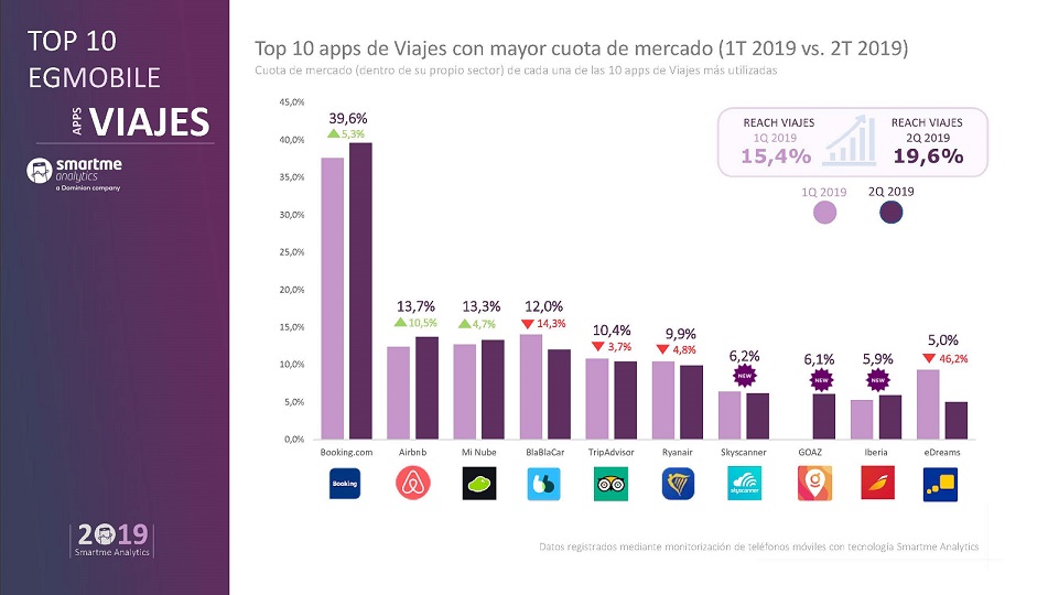 Booking ha incrementado liderazgo entre las apps de viajes según Estudio General Mobile, EGMobile®, elaborado por la empresa pionera en Tecnología Observacional Smartme Analitycs, correspondiente al segundo trimestre de 2019. En este período, Booking aumentó su cuota de mercado en un 5,3% hasta situarse en el 39,6%. También crecieron las apps situadas en segunda y tercera posición. Así, Airbnb, subió un 10,5%, hasta el 13.7% de cuota; y Mi Nube, un 4,7%, hasta llegar al 13,3%.