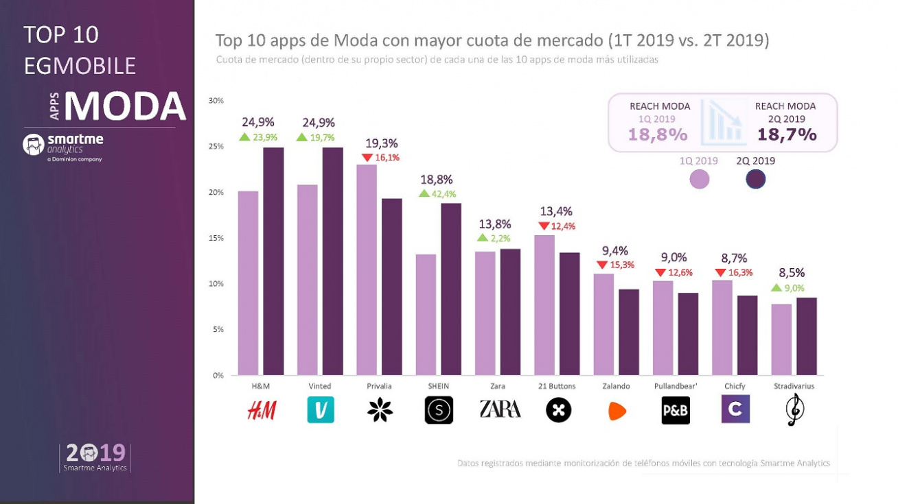 H&M, con una cuota de mercado del 29,9%, lidera por unas décimas las apps de Moda según Estudio General Mobile, EGMobile® correspondiente al segundo trimestre de 2019, elaborado por Smartme Analytics, empresa pionera en el uso de Tecnología Observacional. Le siguen VINTED, con un 29,9% y PRIVALIA, con el 19,3%.