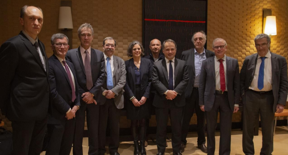 De izquierda a derecha: Cyril Allouche, director de Atos Quantum Lab, Atos. Philippe Duluc, Vicepresidente Senior de la División de Grandes Datos y Seguridad, Atos. Philippe Vannier, Asesor especial del presidente y Director General de Ciencia, Tecnología y Ciberseguridad. Alain Aspect, Profesor del Instituto de Óptica y de la Escuela Politécnica. Sophie Proust, directora de la Oficina de Tecnología de Atos. Artur Ekert, profesor de física cuántica en el Instituto de Matemáticas de la Universidad de Oxford y de la Universidad de Singapur. Elie Girard, Director General de Atos. Daniel Estève, Director de Investigación del CEA Saclay, director de Quantronics. David DiVincenzo, Profesor de la Fundación Alexander von Humboldt, director del Instituto de Nanoelectrónica Teórica del Centro de Investigación Jülich. Serge Haroche, profesor emérito del Collège de France, Premio Nobel de Física.