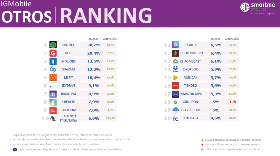 Según Lola Chicón, CEO de Smartme Analytics, “Aunque hemos considerado como normal la aparición en nuestro IGMobile de la Agencia Tributaria, debido a que ha sido el periodo de renta, si es sorprendente y por lo tanto nos gustaría señalar, el crecimiento que experimenta y su posición delante de apps ligadas a entornos como el laboral, compras online, música o salud”.