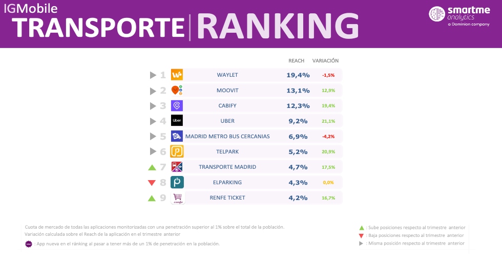 El Top9 se completa con  Uber, que logra un 9,2% y una mejora del 21,1%; Madrid Metro Bus Cercanías, con el 6,9% y una caida del 4,2%; Telpark, con un 5,2% y una mejora del 20,9%; Transporte Madrid, con un 4,7% y una subida del 17,5%; El Parking, con un 4,3% y Renfe Ticket, con un 4,2% y una mejora del 6,7%. Por su parte, el reach del sector en el conjunto de app de transporte, pasa del 24,4% al 35,6%, lo que demuestra una recuperación de la actividad y de las empresas del sector.