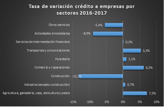 Gráfico 1 Tasa de variación del crédito a empresas por sectores de actividad (2017). Fuente: Elaboración propia en base a datos del Banco de España