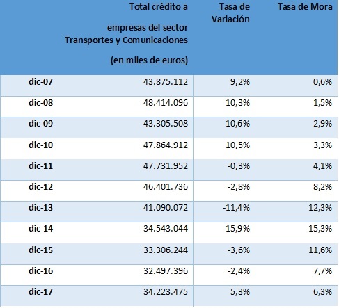 El año 2017 es el primero en que la tasa de variación de la cartera de créditos a las empresas de este segmento ha alcanzado un crecimiento positivo, tras 6 años consecutivos en tasas negativas. De hecho, si se considera la evolución de la cartera en la última década, se observa que el total del crédito a empresas de transportes y comunicaciones ha caído un 22% desde 2007, pasando de 43.800 millones de euros a los actuales 34.200 millones.