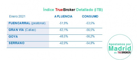 El mes de febrero de 2021, con una caída del consumo en las calles de Madrid de un 43%, trae la noticia positiva, al ser el segundo mejor mes en todo el Covid, tras el de sept20 (-37%). Tal y como asegura Pablo Beltrán, CEO de Truebroker “está por averiguarse en los siguientes meses si se ha tratado de un hecho aislado, por efecto de un rebote psicológico, al poder salir tras acabarse el impacto de la nieve en la primera quincena de enero, que nos impidió salir a comprar, o si se consolida y consigue mantenerse otro mes la tendencia”.