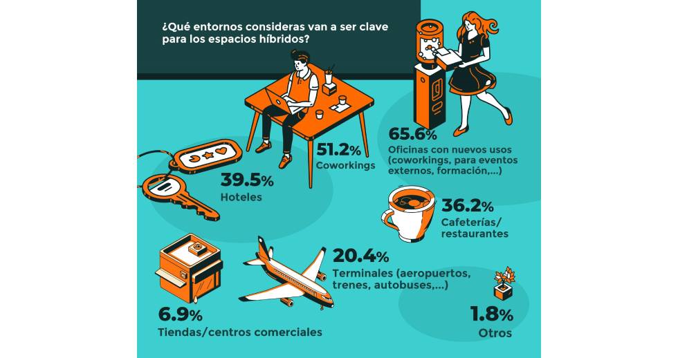 Al analizar qué entornos van a ser claves para los espacios híbridos, destacan las oficinas con nuevos usos (como coworkings, para eventos externos o formación entre otros) con el 65,6%, seguidas por el 51,2% de los coworkings, los hoteles con el 39,5%, las cafeterías y restaurantes con el 36,2%, las terminales de transporte con el 20,4% y tiendas o centros comerciales con el 6,9%.