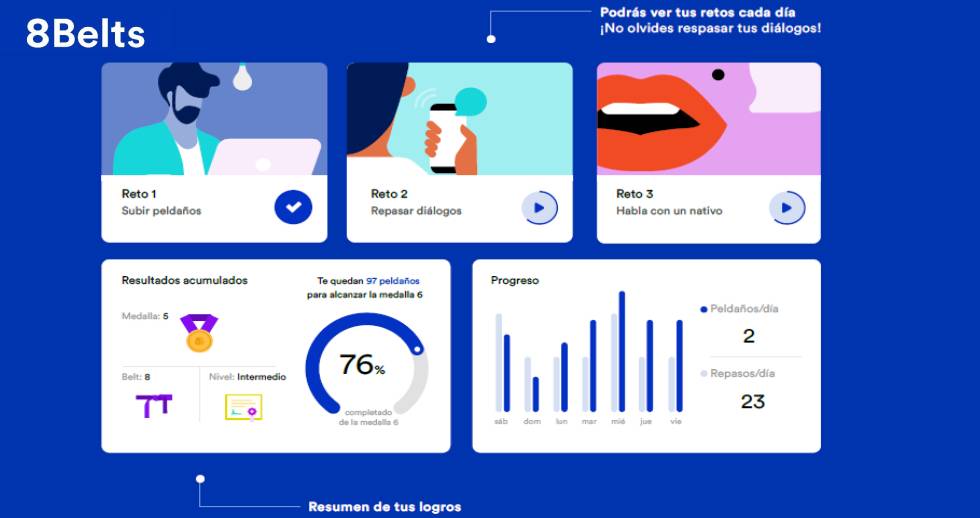 Además, cada empresa cuenta con un coach especializado de 8Belts encargado del bienestar de cada empleado y del desarrollo de un plan de motivación que le acompaña al 100%. La metodología se completa con una evaluación constante del progreso del alumno, en la que el coach mantiene un contacto continuo con el profesional del área de formación encargado de la cuenta de 8Belts. Ambos disponen de un panel de control, que muestra en tiempo real el avance de cada alumno, además de informes periódicos de carácter cualitativo.