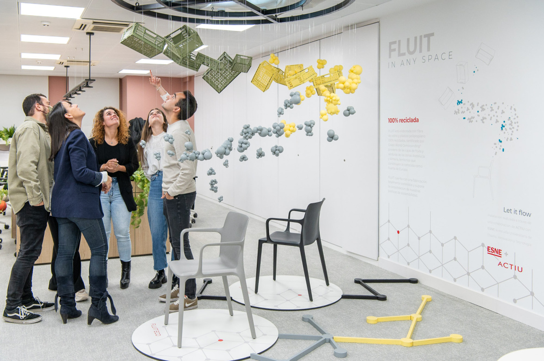Actiu ha unido fuerzas con los jóvenes talentos de ESNE, Escuela Universitaria de Diseño, Innovación y Tecnología para escenificar físicamente el concepto de economía circular. En el marco de la asignatura de último curso de “Escenografía” del Grado de Diseño de Interiores, liderado por el profesor de la asignatura Carlos Vivó, el proyecto del equipo compuesto por Alejandro Guede, Marta Sanz, Marta Mesquida y María Menéndez ha sido el seleccionado por Actiu para plasmar su visión sobre la sostenibilidad de Fluit.