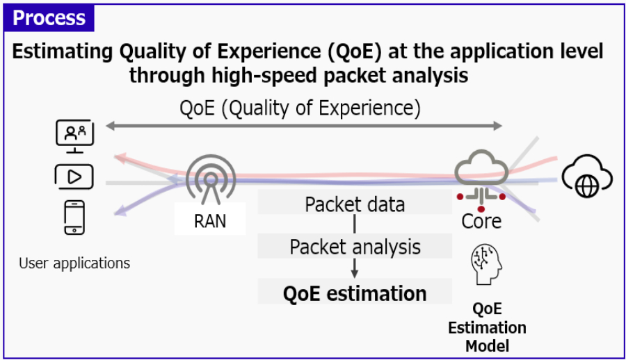 Esta tecnología estima la QoE en tiempo real y cambia automáticamente a los usuarios a otras zonas de la red de estaciones base cuando se detecta una degradación de la QoE. Se trata de una primicia mundial que permite la creación de modelos de IA capaces de estimar fácilmente la QoE para aplicaciones individuales seleccionando valores de características a partir de datos estadísticos (KPI) calculados a partir del análisis de paquetes de alta velocidad para tráfico RAN de 100 Gbps. Este enfoque permite una adaptación flexible a diversas aplicaciones.